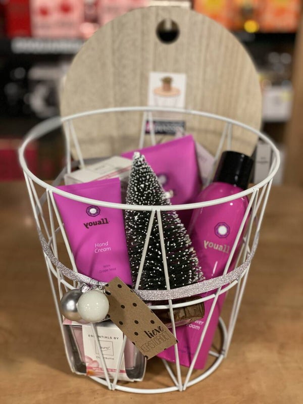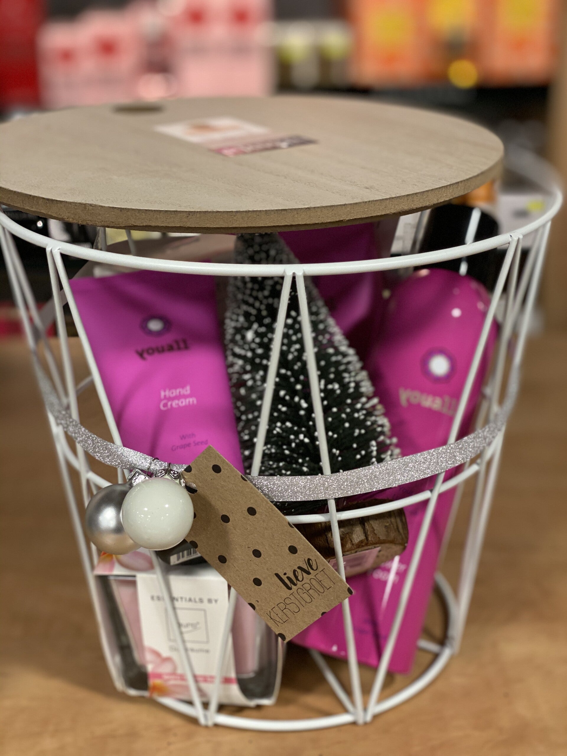 Inhoud: cadeauset in stalen mand met houten deksel, showerfoam 200 ml, scrub 200 ml en handcreme, Ipuro geurkaars en geurstokjes, mini kerstboom #Youall #Vegan
